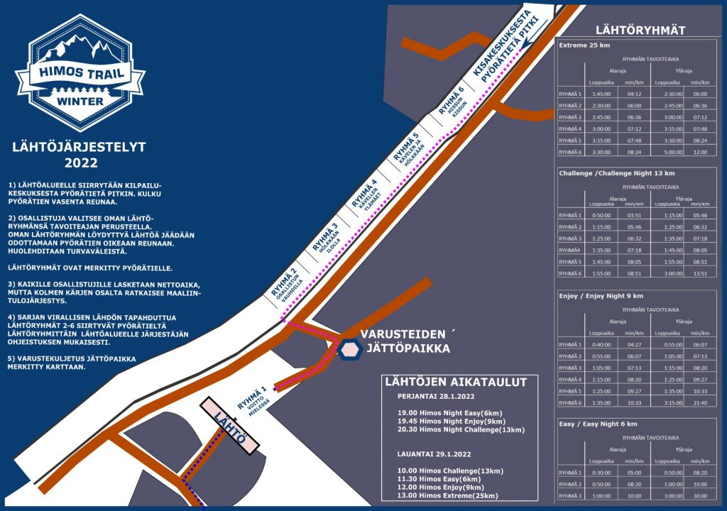 HUOM! Lähtötilanteeseen väljyyttä ja turvavälejä luodaksemme käytössä on lähtöryhmät. Jokainen Himos Winter Trail -sarja on jaettu 3-6 lähtöryhmään. Ensimmäinen ryhmä asettuu lähtöalueelle ja seuraavat ryhmät omiin lähtöryhmiinsä lähtöalueelle kulkevan viitoituksen varteen. Valitse jo ennen tapahtumaa oma lähtöryhmäsi tavoiteaikasi mukaan, jotta osaat asettua oikeaan lohkoon lähtöviitoituksen varrella. Lähtöviitoituksen varressa lähtöryhmät ovat merkattu selkein kyltein ja merkinnöin.