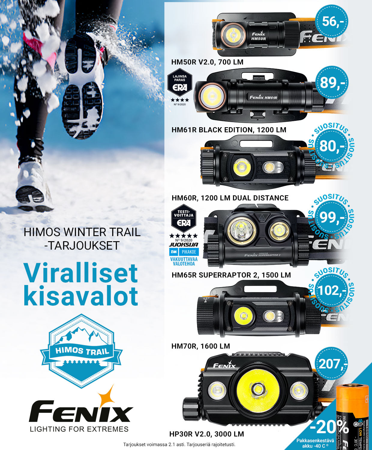 Muista myös hankkia pakkasenkestävä erikoisakku otsalamppuusi!